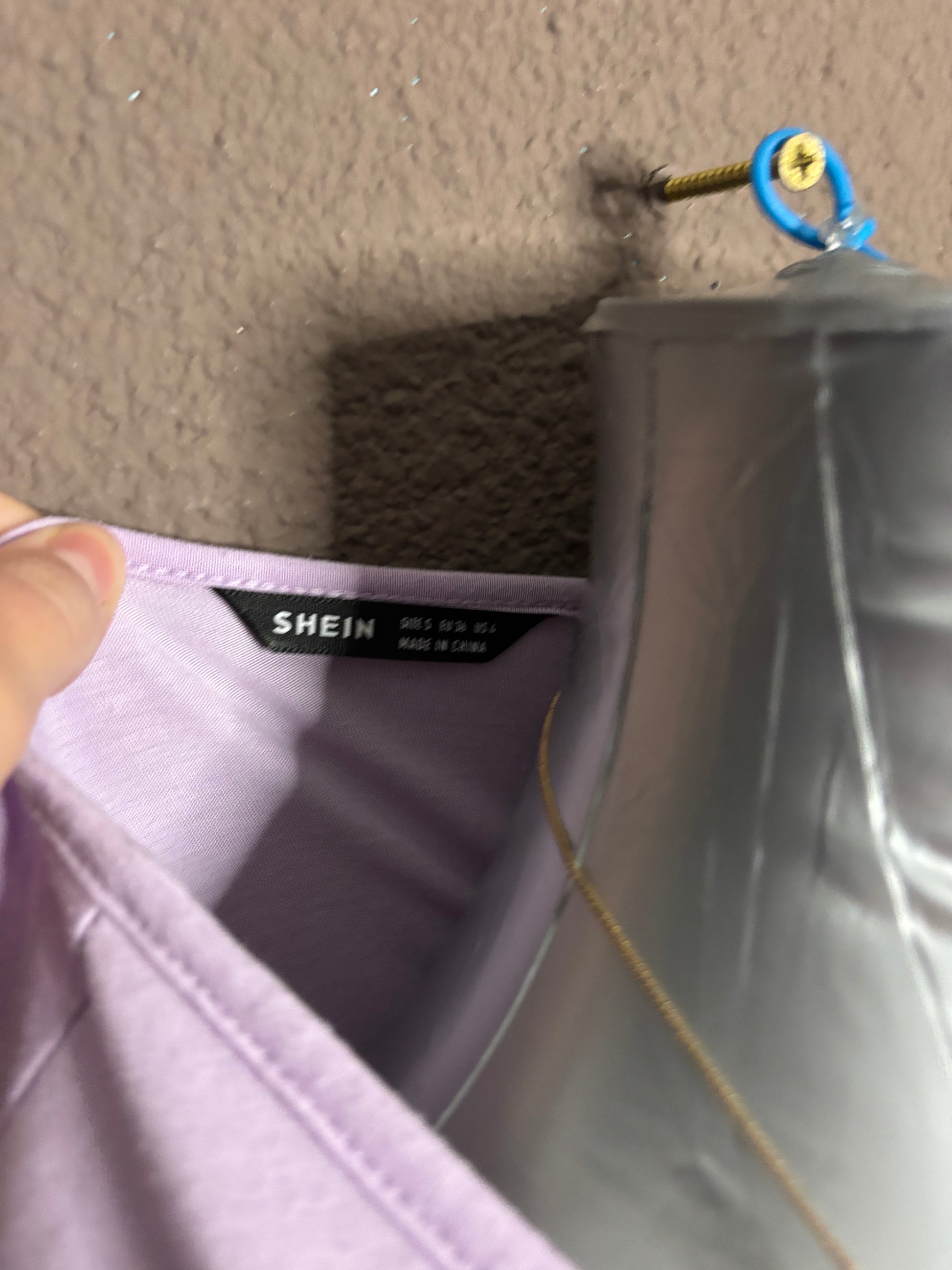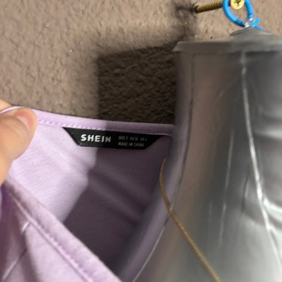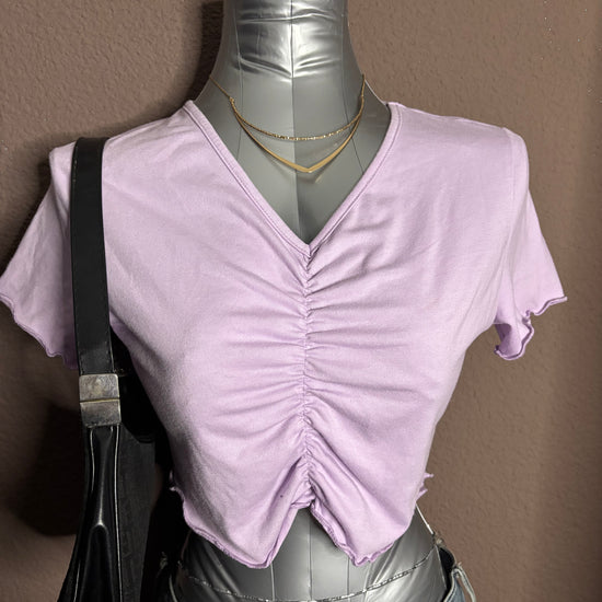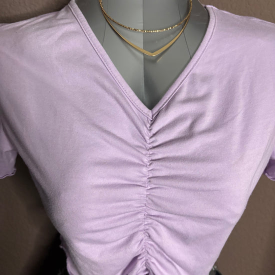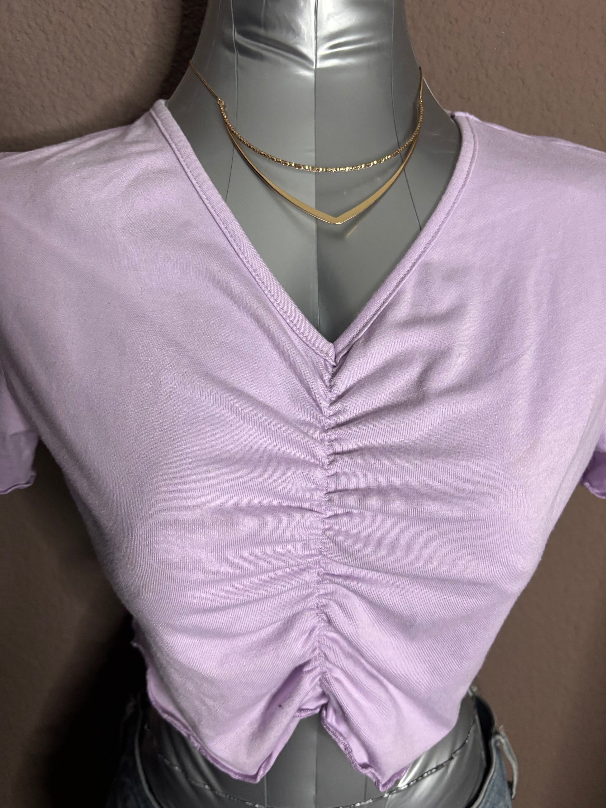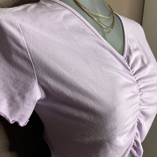 Haut basique lilas avec fronces à l’avant. Coupe courte facile à porter au quotidien.