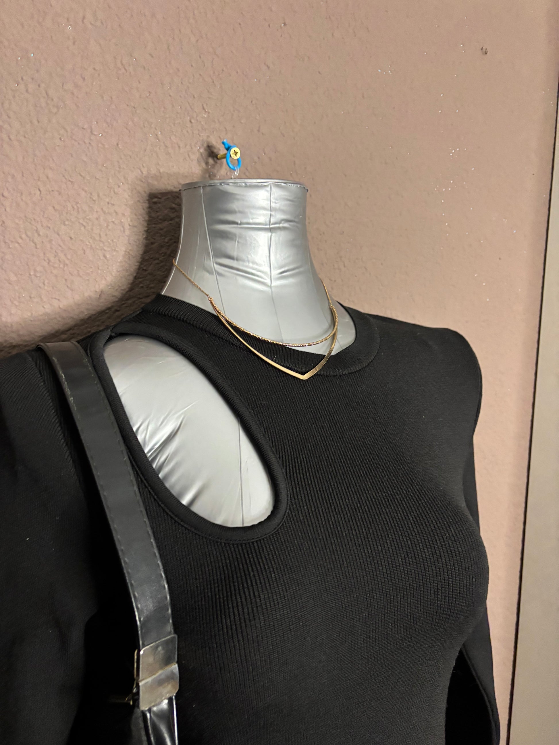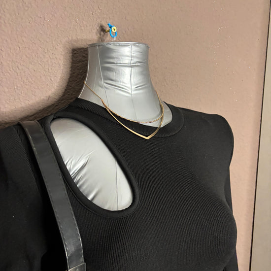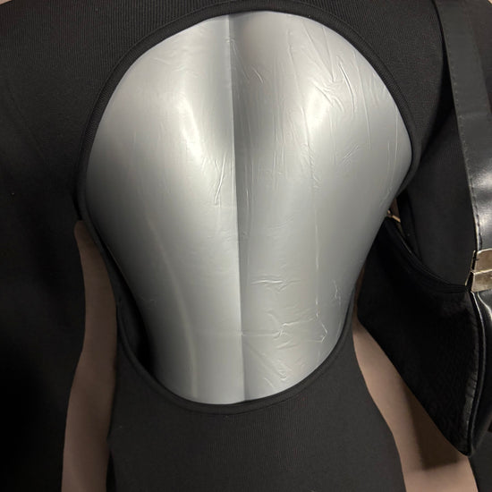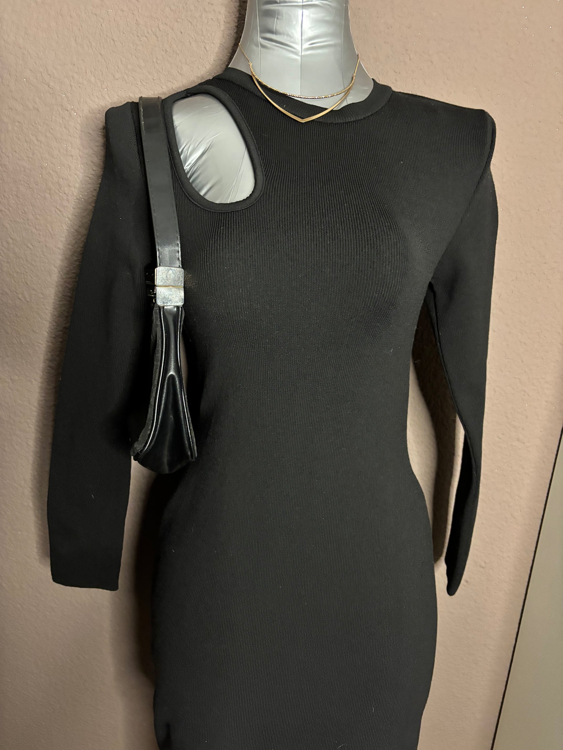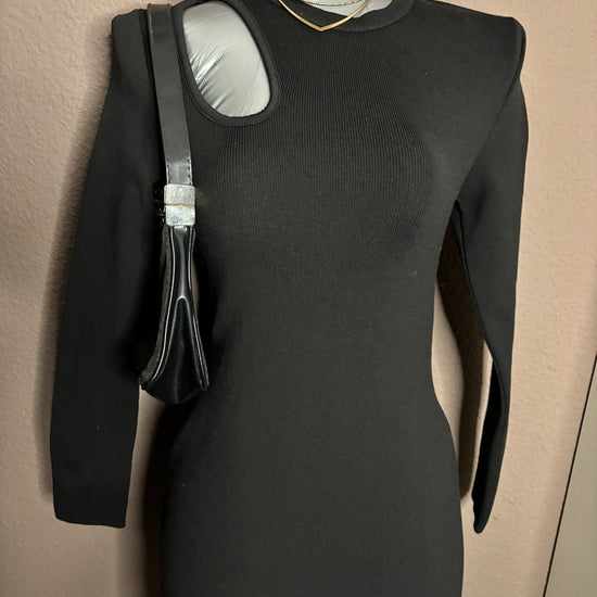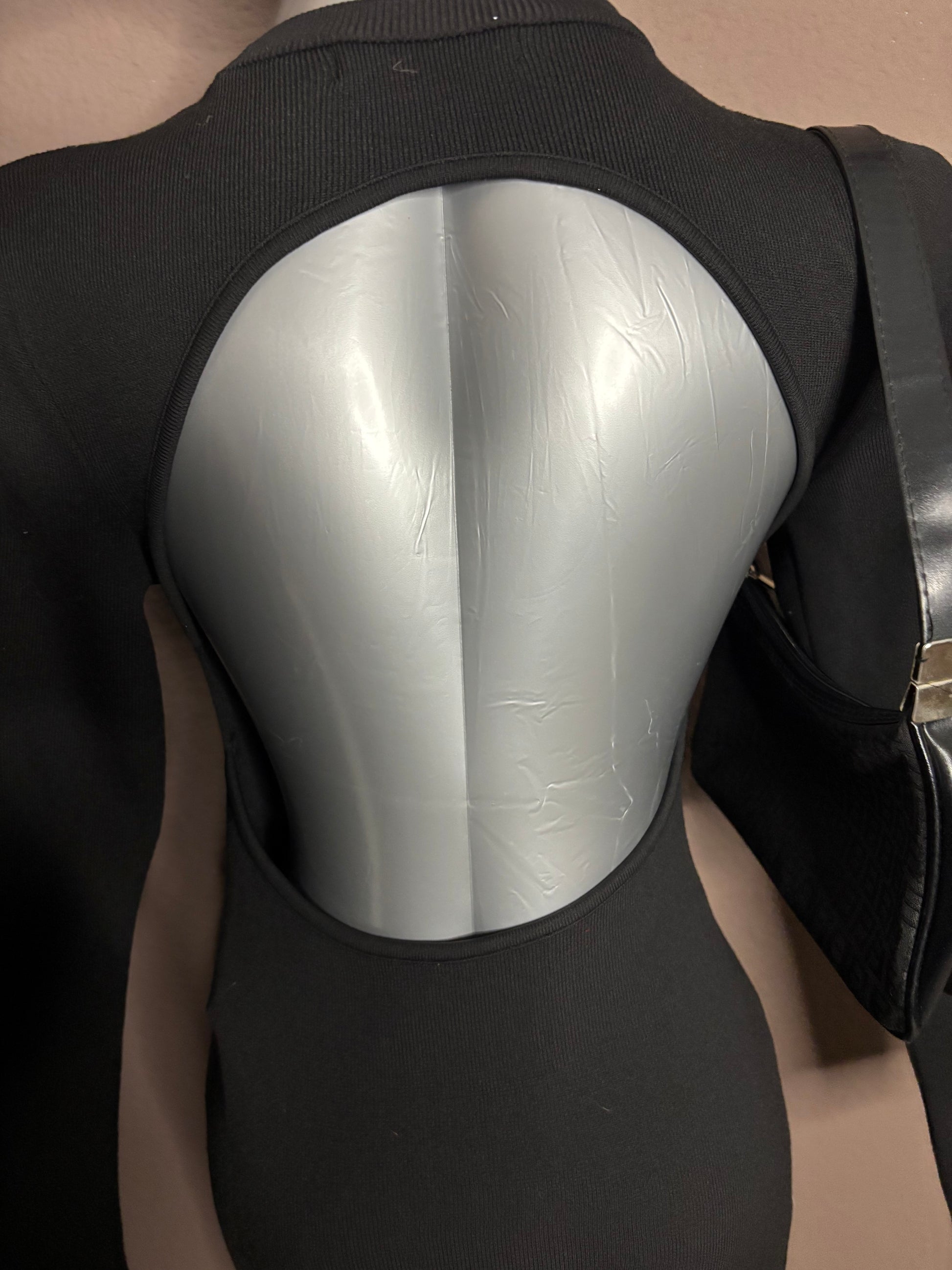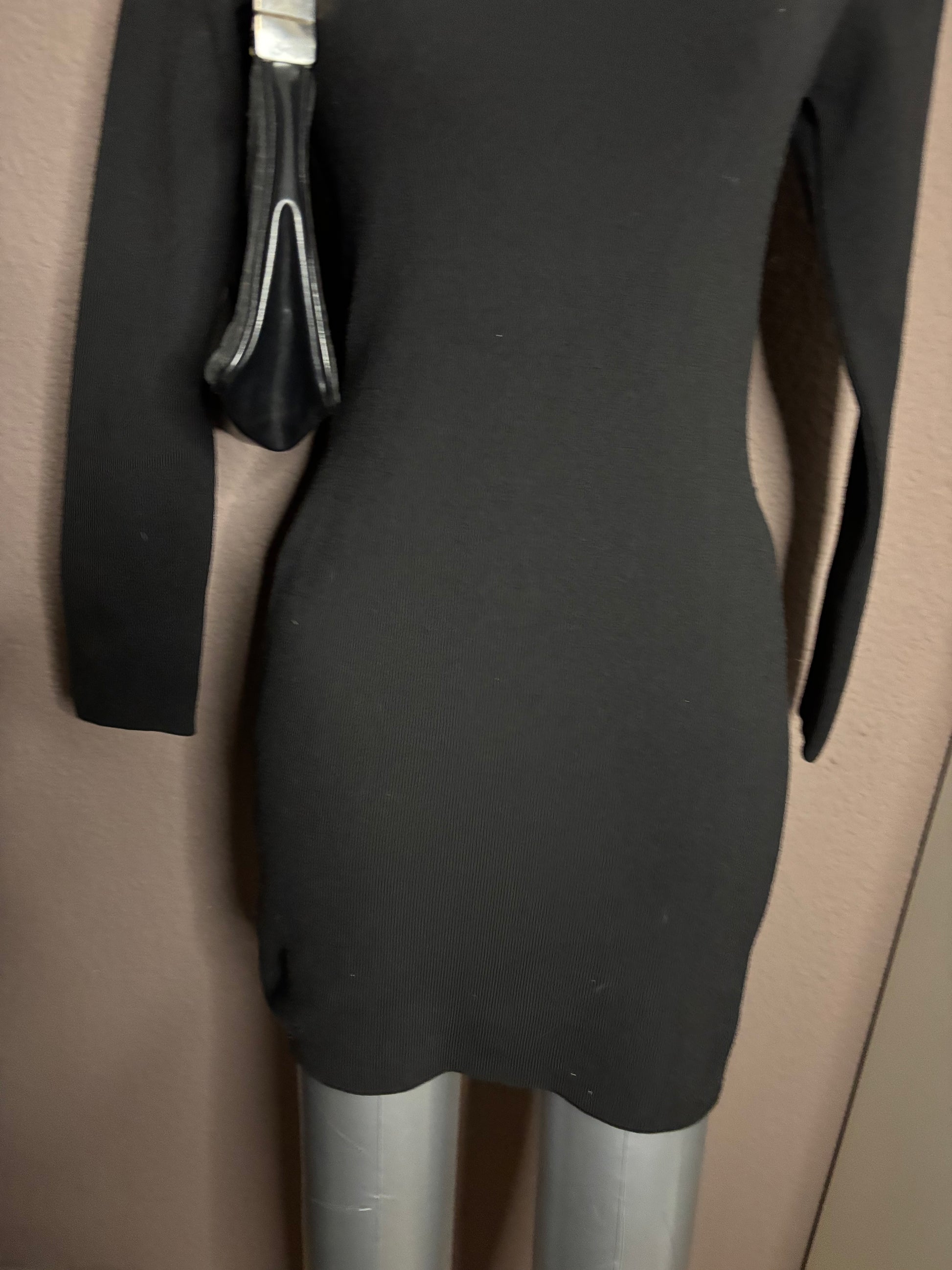 Robe noire en maille côtelée, manches longues, avec une découpe originale au dos laissant apparaître le haut du dos. Coupe ajustée qui épouse la silhouette tout en restant confortable grâce à sa matière extensible.