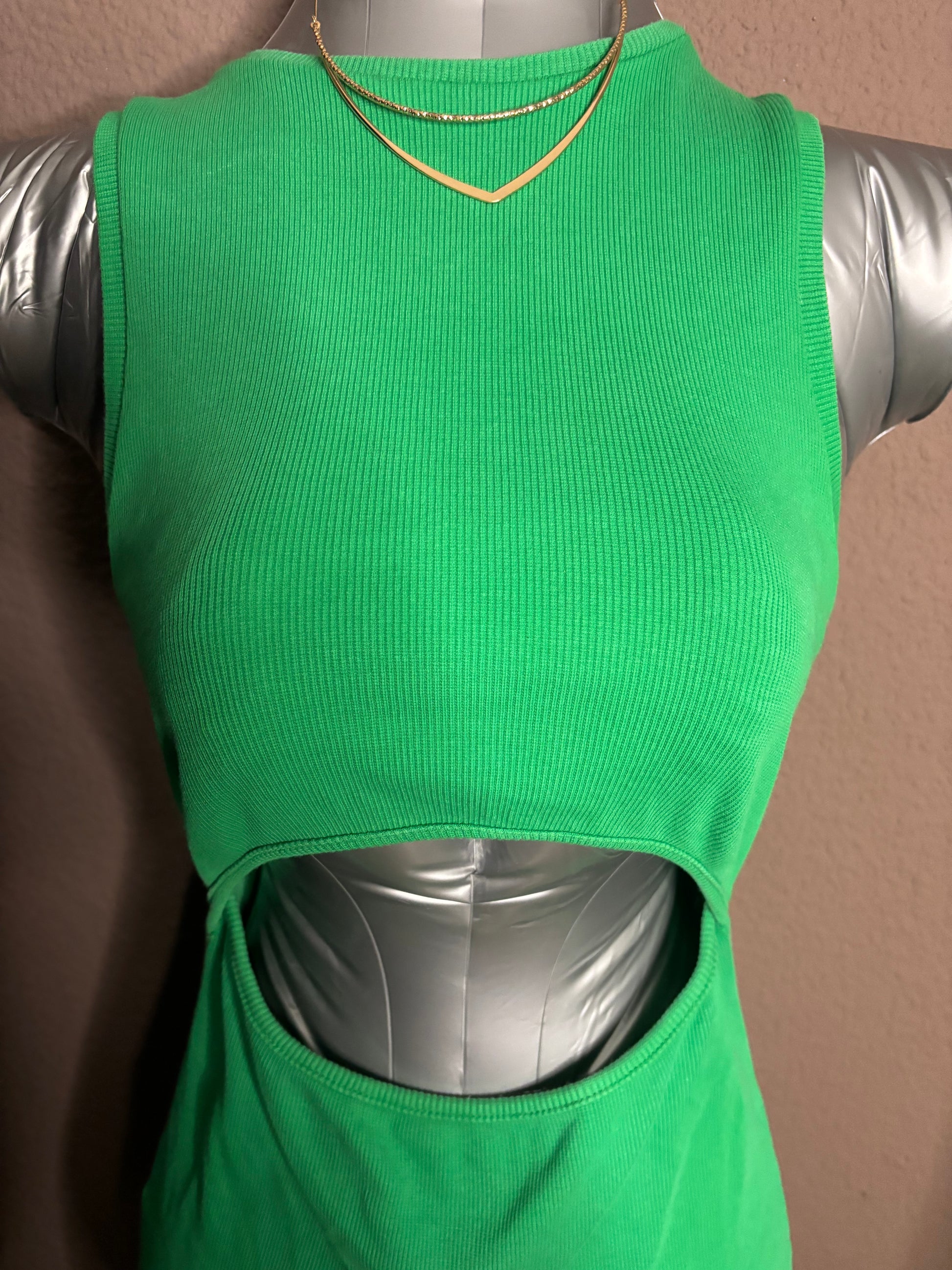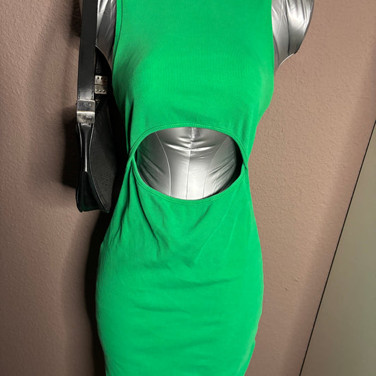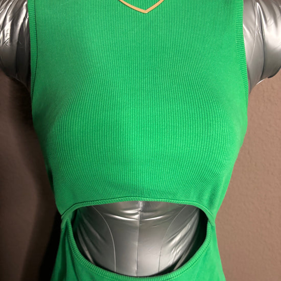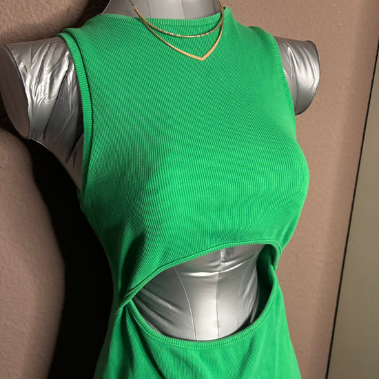 Robe verte côtelée ultra flatteuse, avec une découpe ajourée à la taille qui apporte une touche sexy et tendance sans en faire trop. La matière est extensible et épouse parfaitement les formes.