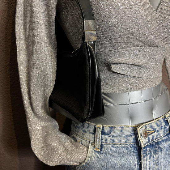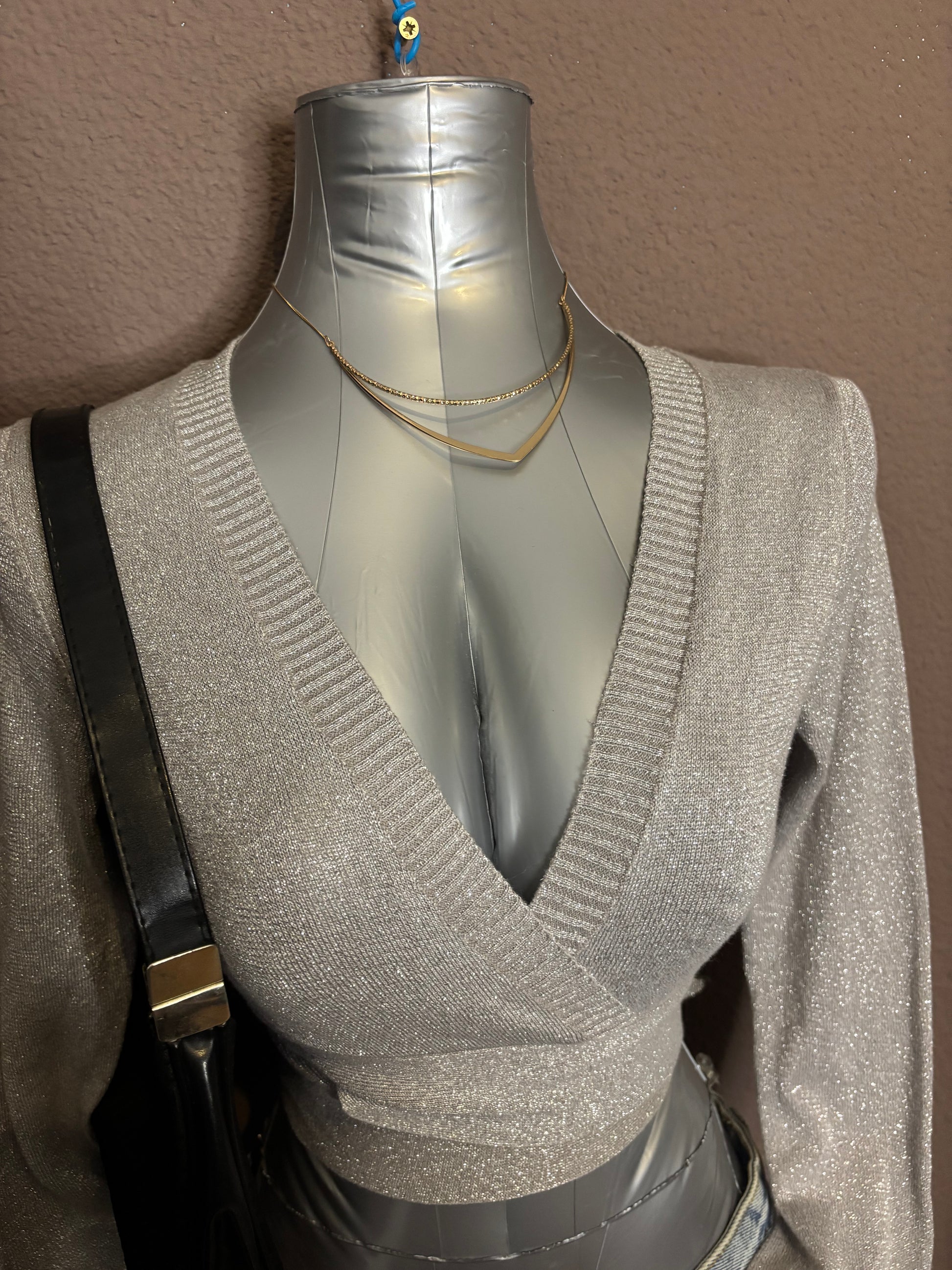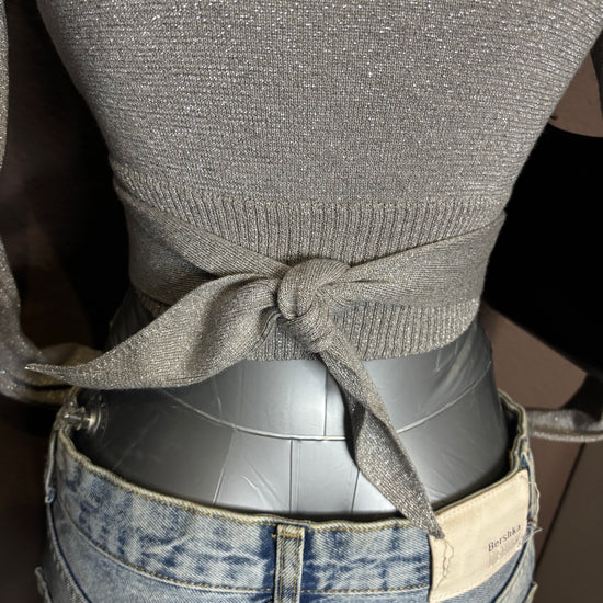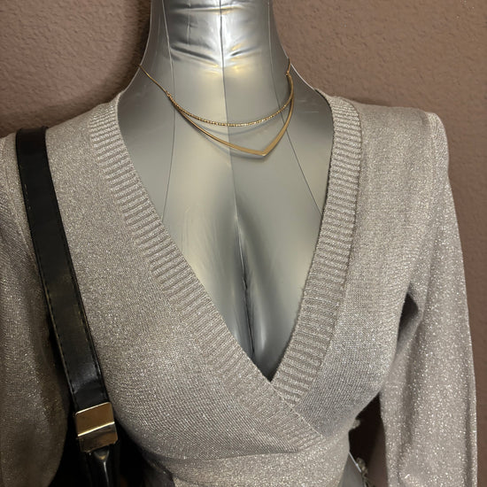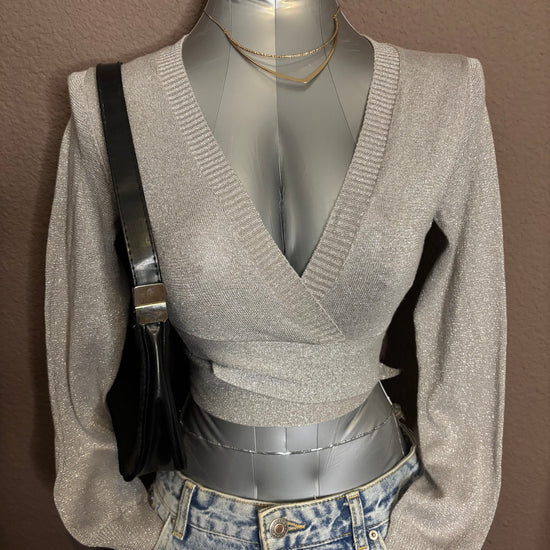 Top argenté à manches longues, avec un décolleté cache-cœur et une coupe légèrement courte. Maille fine pailletée, douce et extensible. Parfait pour une soirée, une sortie ou un look festif chic.