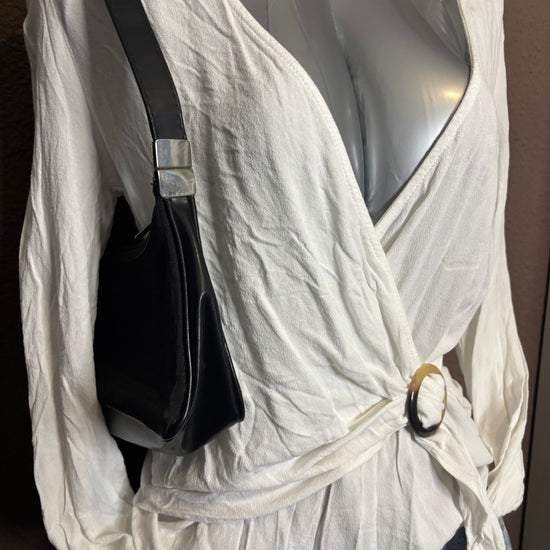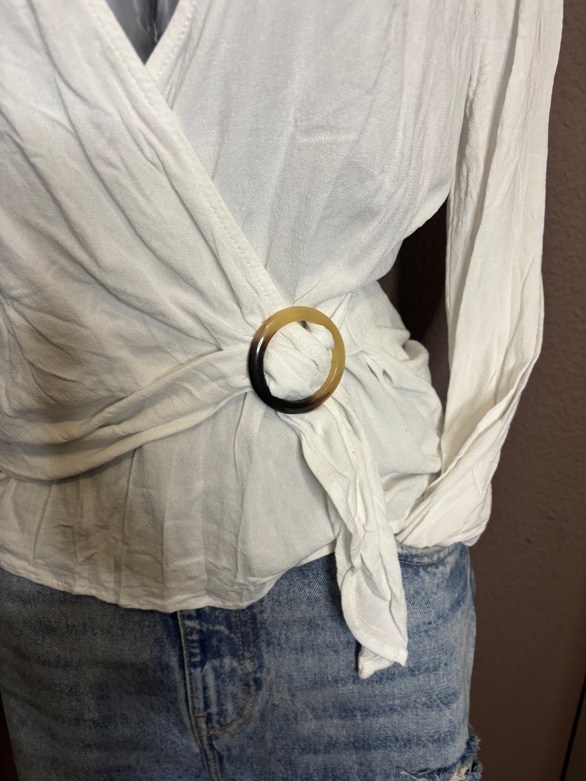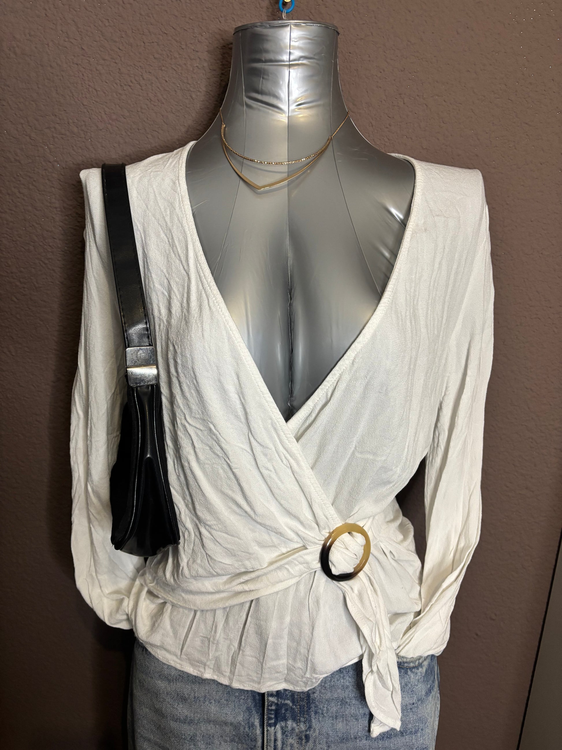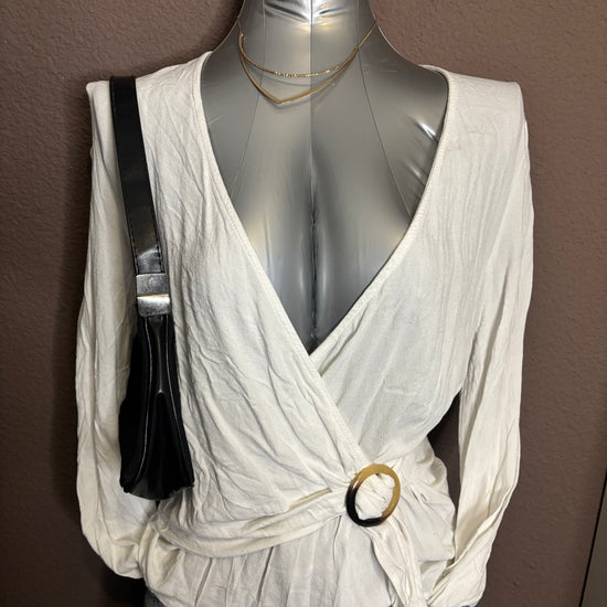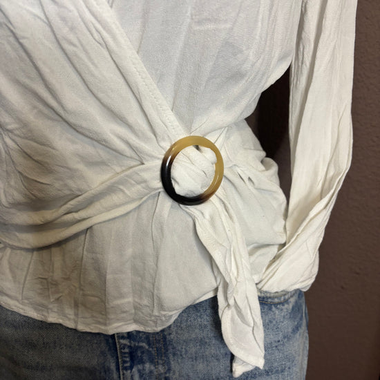 Top blanc à manches longues avec col cache-cœur et décolleté en V. Fermeture par lien sur le côté avec une boucle décorative, permettant d’ajuster la coupe. Matière légère et agréable, idéale pour la mi-saison ou les soirées d’été.