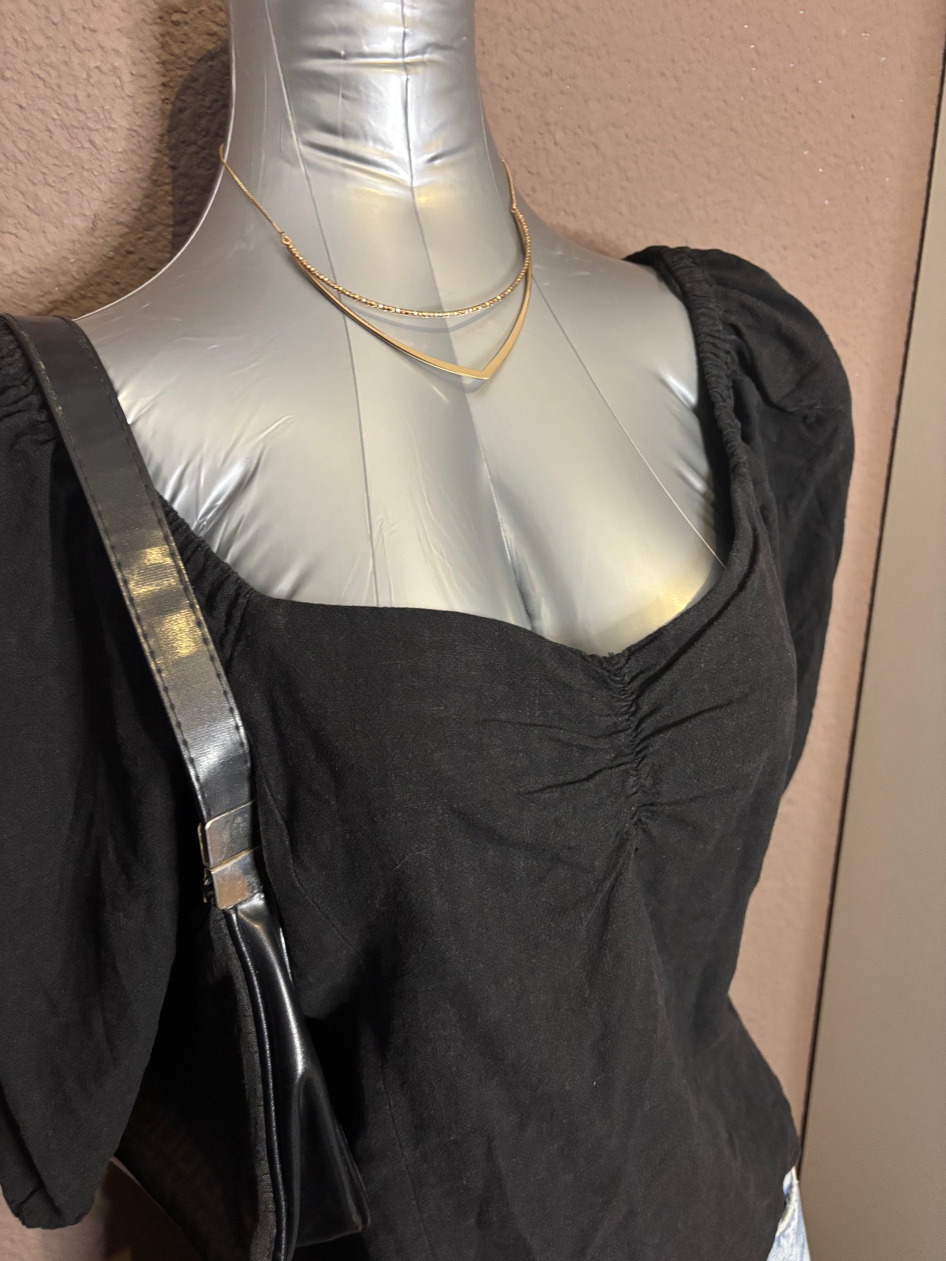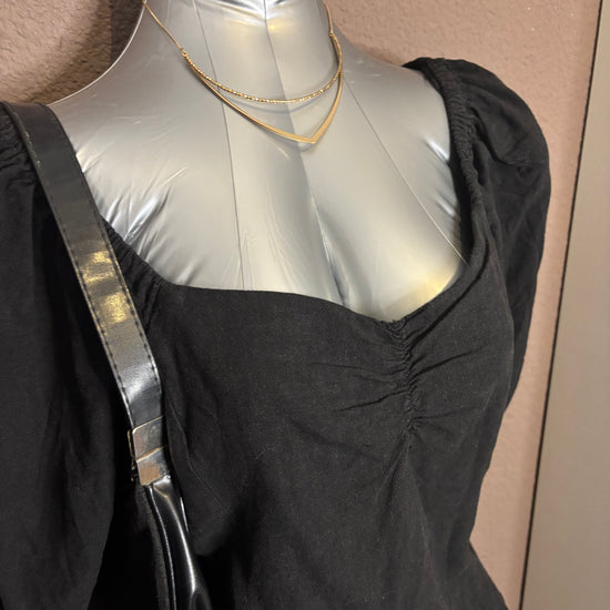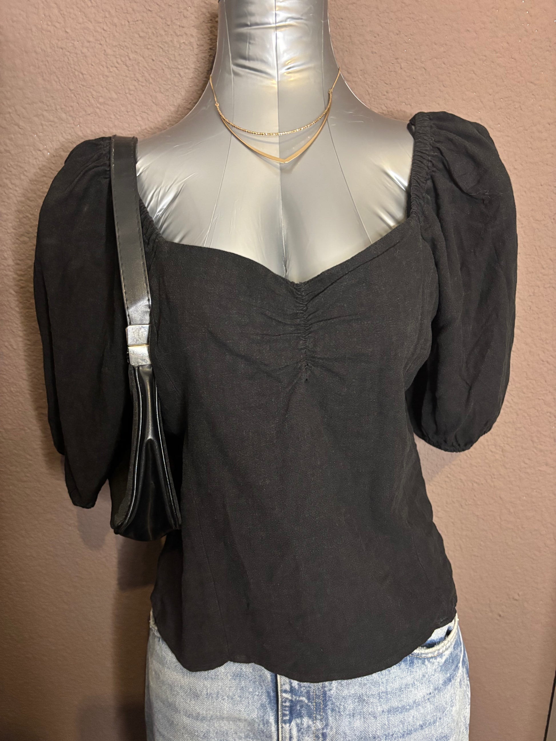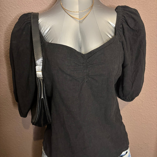 Top noir à manches courtes bouffantes avec encolure en cœur légèrement froncée sur le devant. Coupe flatteuse et confortable, matière légère avec mélange de lin, idéale pour la belle saison comme pour les soirées.